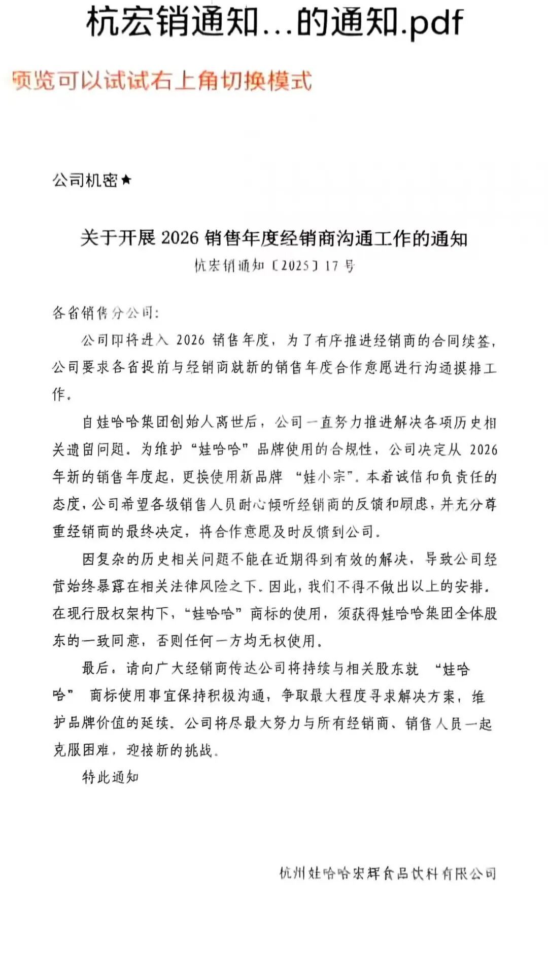 9月13日,一份“关于开展2026销售年度经销商沟通工作的通知”(简称“通知”)在网上流传。文件中提到,为维护“娃哈哈”品牌使用的合规性,公司决定从2026年新的销售年度起,更换使用新品牌“娃小宗”。因复杂的历史相关问题不能在近期得到有效解决,导致公司经营始终暴露在相关法律风险之下。因此,我们不得不做出以上的安排……